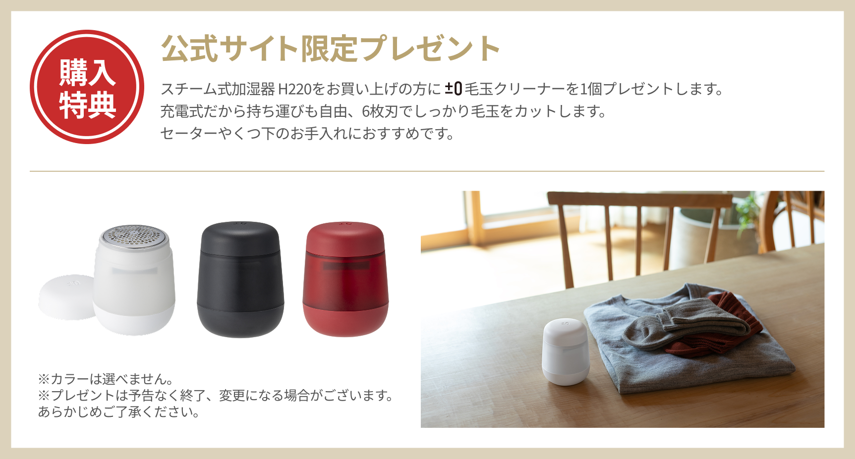 そして今だけ、公式サイトでH220をご購入の方に、冬の衣料のお手入れに便利な「毛玉クリーナー」をプレゼント。