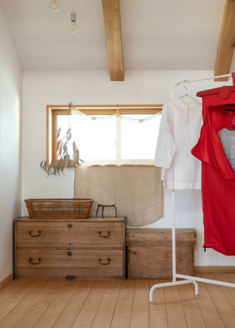 吹き出し口は中央1ヶ所になります。その真下にハンガー掛けを設置しました。衣類と衣類の間を開け、風がよく通るように吊るすと早く乾きます。