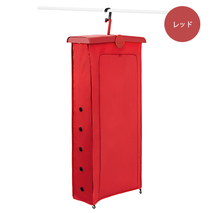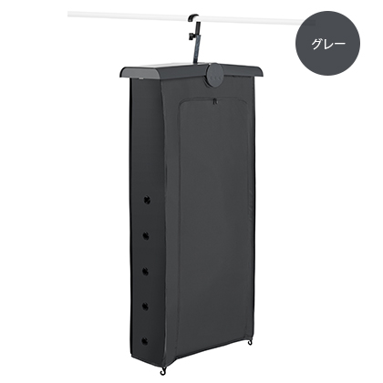 吊り下げフックを開いてハンガーパイプなどに吊り下げ、フラップを開きます。吊り下げフックを開くと、フラップが開いた状態で固定されます。吊り下げフックをたたむと固定が解除され、折りたためるようになります。
