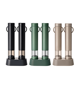 本体天面を押すと挽きたての塩やこしょうが自動で出てくる便利な電動タイプ。先端の調整つまみで粗さを自分好みに調節できます。肉やパスタなどを調理しながら片手で味付けが簡単にできます。1本(キャップ付き)と2本セット(スタンド付き)があります。ワイヤーリング付きだから吊るして収納もできます。iF デザイン賞2024を受賞。