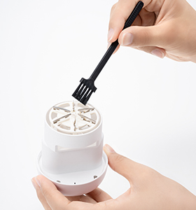 外刃を下にした状態で本体をゆっくり外し、毛玉クズを捨てます。付属の掃除用ブラシで内刃のお手入れも可能です。