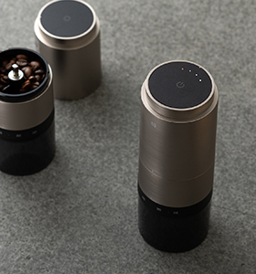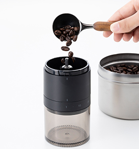 スイッチひとつでいつでも挽きたてのコーヒーが楽しめる電動コーヒーミルです。1回で約25gの豆を挽くことができます。豆が挽き終わったら自動停止、USB充電式なのでキャンプや野外にも持ち出せます。刃は摩擦熱の少ないセラミック製で、幅広い挽き目に対応できるコニカル式を採用しました。