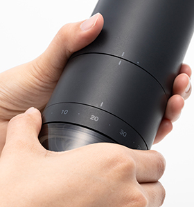 刃は摩擦熱の少ないセラミック製で、臼式やプロペラ式と違い豆を均一に挽くことができるコニカル式です。極細挽きから粗挽きまで幅広い挽き目に対応できます。