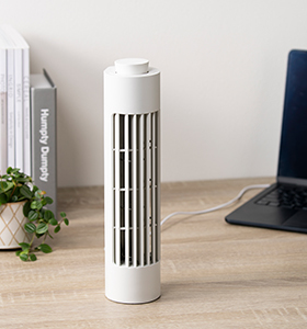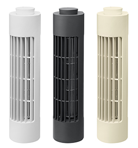 デスクや洗面所などちょっとした場所に収まるよう、コンパクトにデザインしました。ルーバーやスイッチも全て同色で揃えたのですっきりとした印象です。立てても横にしても使えます。