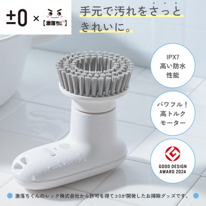 激落ちくんのレック株式会社から許可を得て±0が開発した本格的なお掃除グッズです。IPX7の高い防水性で水につけながら掃除が可能です。バスルームの床、上履き、車のホイール等、手元で汚れをさっときれいにしたい時に便利です。電動ブラシは汚れを落とそうと本体を押し付けると、トルクが弱くて止まってしまうものも多い中、【激落ちくん】コードレス電動ブラシは高トルクモーター搭載なので止まらずにしっかり稼働して汚れを落とします。ブラシの他に2種類のパッドも付属、用途に合わせて使い分けができます。2024年度グッドデザイン賞、iF デザイン賞2025を受賞。