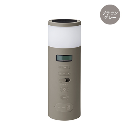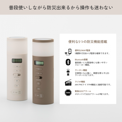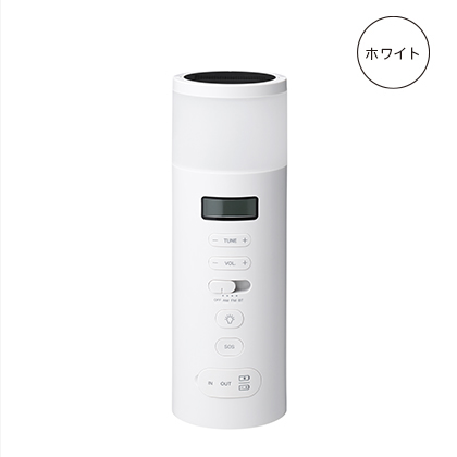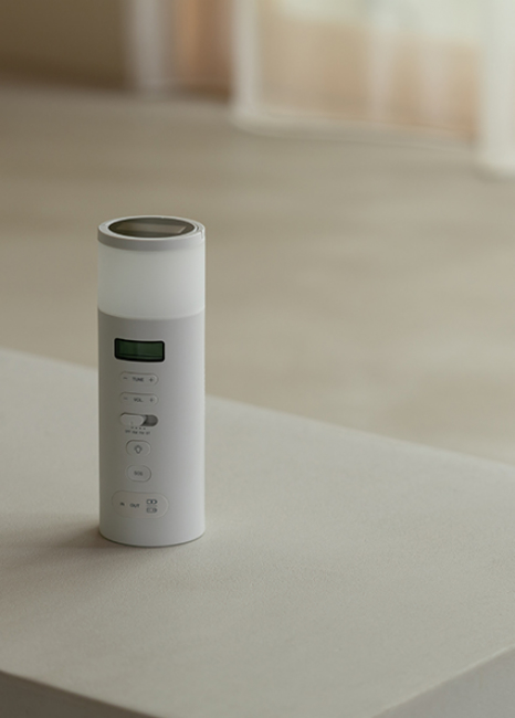 ラジオを含め5つの防災機能(5WAY電源、AM/FMラジオ、LEDランタン、緊急用SOSアラーム、Bluetoothスピーカー)を搭載した便利なマルチタイプです。もしもを想定しACアダプター、ソーラーパネル、手回し充電ハンドル、乾電池、蓄電池の5種類から電源を確保します。正面に全ての操作ボタンを集め操作性を高めました。寝室の間接照明やリビングのスピーカーとして、普段の生活でも使えるようシンプルなデザインにまとめました。カラーも3色、お部屋に合わせて選べます。インテリアにとけ込みながらもしっかり備える、新しい防災のかたちです。2024年度グッドデザイン賞を受賞。