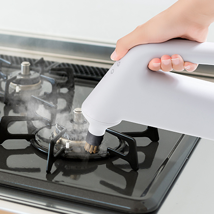 連続運転は弱モードは約15分、強モードは約10分。100℃以上の高温スチームがたっぷり噴出し、ガスコンロや電子レンジ庫内の頑固な汚れを浮き上がらせるから、洗剤を使わずにお掃除が可能です。赤ちゃんのおもちゃなどにも安心して使えます。