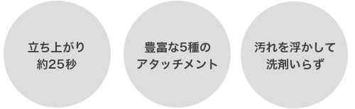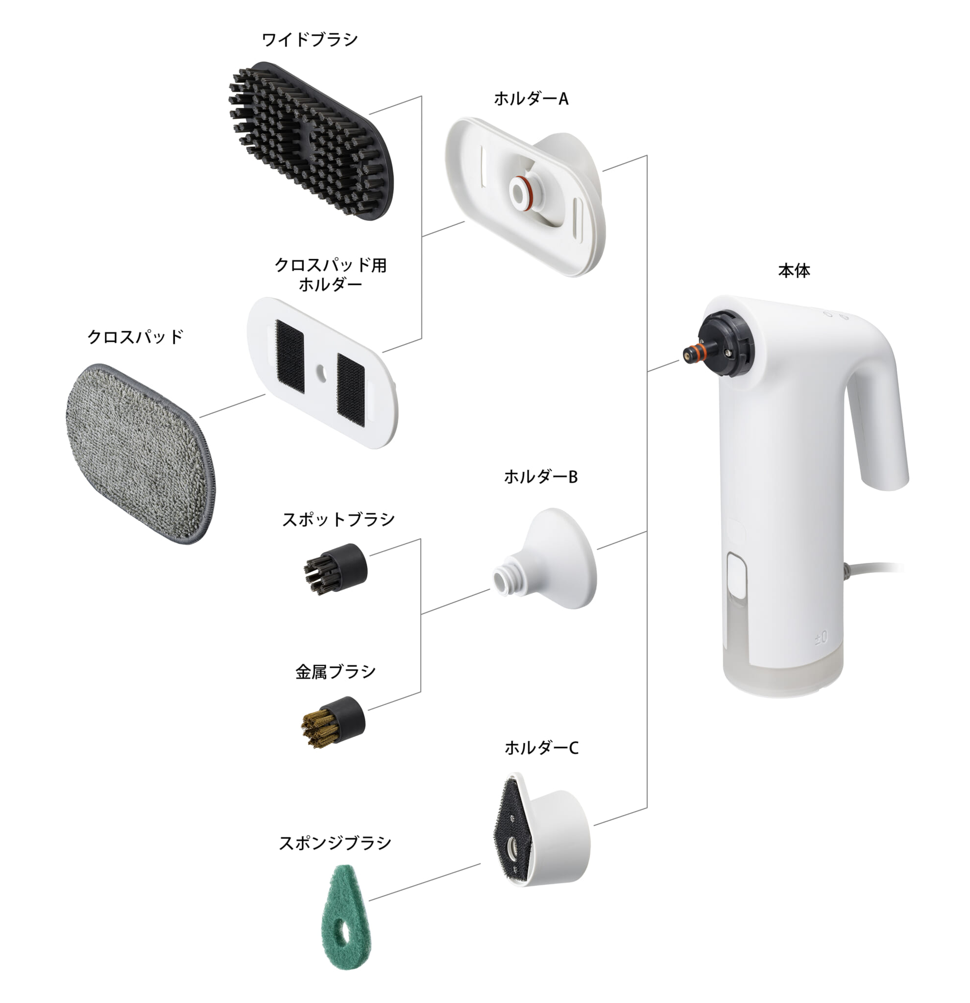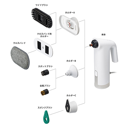| 本体・付属品 | 本体/計量カップ/ホルダーA/ワイドブラシ/クロスパッド(2枚)/クロスパッド用ホルダー/ホルダーB/スポットブラシ/金属ブラシ/ホルダーC/スポンジブラシ(3枚)/取扱説明書[保証書付](1) |
