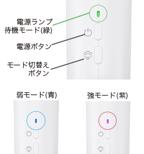 電源を2秒ほど長押ししてチャイルドロックを解除します。点灯を開始し25秒後にランプは緑になり待機モードとなります。モード切替えボタンでスチームの強弱(1回押すと弱、2回押すと強)を選びます。