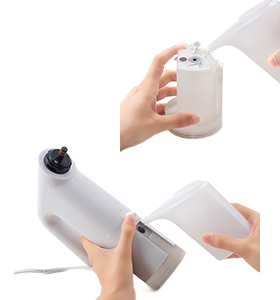 水タンク容量は220ml、コンパクトサイズながらもしっかりスチーム作業ができます。給水に便利な計量カップ付き。本体に水タンクをセットしたままでも給水可能です。