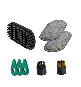 ワイドブラシ(1個)、クロスパッド(2枚)、スポンジブラシ(3枚)、金属ブラシ(1個)、スポットブラシ(1個)の5種類のアタッチメント付きで、家中のお掃除が可能です。アタッチメントに合ったホルダーを取り付けてから、セットしてください。クロスパッド、スポンジブラシ、金属ブラシ、スポットブラシは別売品もあります。