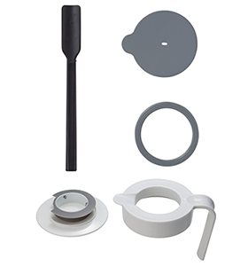 毎日の使い勝手を考え、スパチュラ、電子レンジ用フタ、取っ手付きホルダー、タンブラーにセットするゴムパッキンの替えが付いています。タンブラーにつける専用ゴムパッキン5個入りもございます。